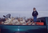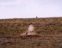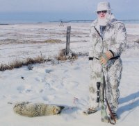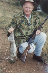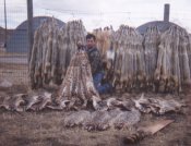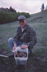 May 98 - The late and missed Allan Hotsinpillar of Stevensville, MT with a Bucket "O" Gophers was impressed with the .19 Calhoon. He never even had to stop and clean his barrel for this bucket full! |