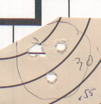 5 shots loaded with 13.3 gr. of Viht N120 and 32 gr. Dbl HP bullets, 3320 ft/sec. |
