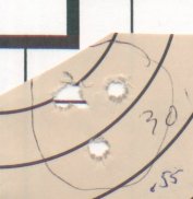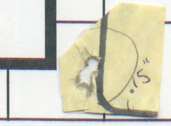 5 shots loaded with 13.0 gr. of AA 1680 and 37 gr. Dbl HP bullet, 2940 ft/sec. |