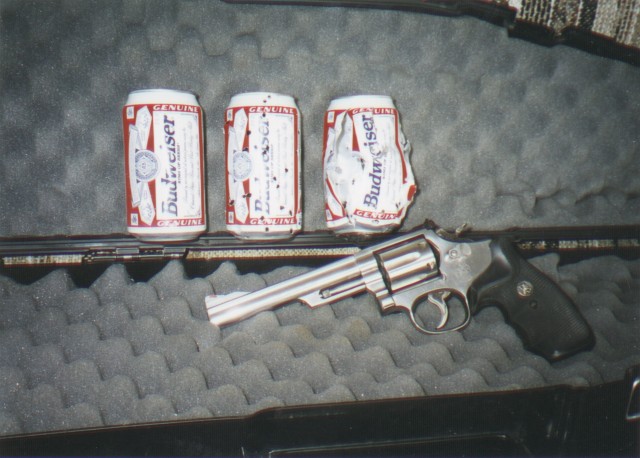 Bud Cans (left to right): Unshot can, an empty can shot with a "Snake Load", a full can blasted with a "Snake Load" (no the Bud contents werent wasted. The can was filled with water!) We used Budweiser as they are pro-gun and therefore we are pro-Bud! Included is my favorite Model 66 Smith and Wesson 357 Mag.